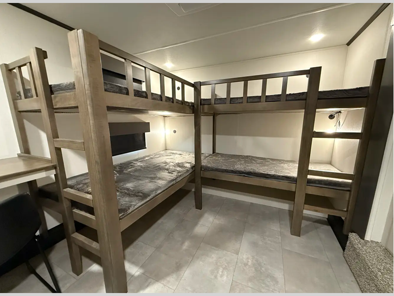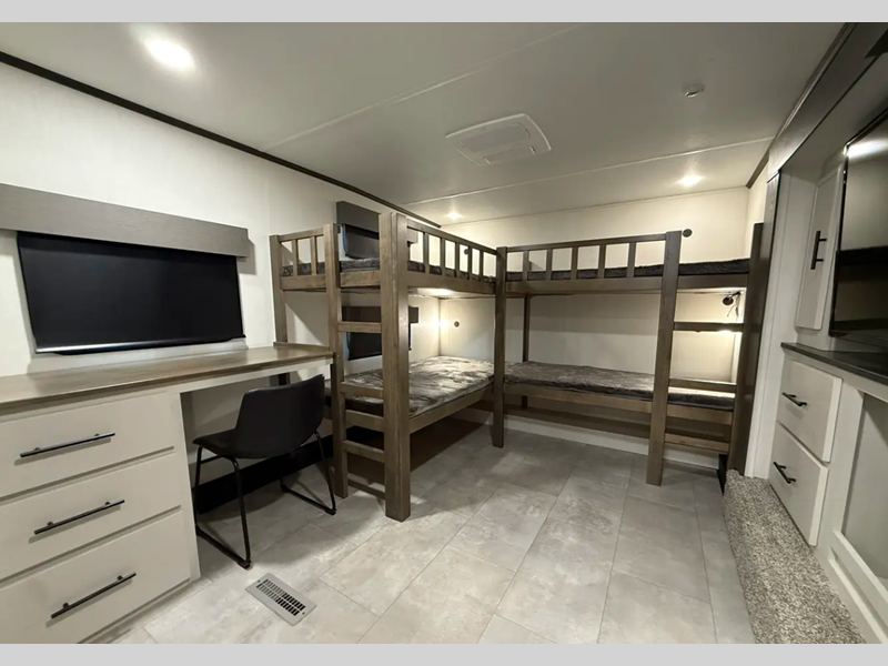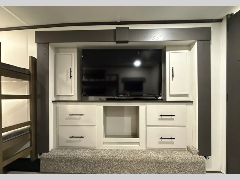 Sleeps 6 Slides 4 Length 43 ft 9 in Ext Width 8 ft 6 in Ext Height 13 ft 3 in Hitch Weight 2675 lbs Dry Weight 14224 lbs Cargo Capacity 2451 lbs Fresh Water Capacity 54 gals Grey Water Capacity 78 gals Black Water Capacity 78 gals Number Of Bunks 4 Available Beds King Refrigerator Type 12V Refrigerator Size 16 cu ft Cooktop Burners 4 AC BTU 18000 btu TV Info LR 50" 4K TV, BR 4K Smart TV Awning Info Electric Awning with LED lighting Axle Count 2 Washer/Dryer Available Yes Shower Type Standard Electrical Service 50 amp Similar Floorplans